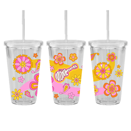 16 oz. Double Wall Clear Plastic Tumbler printed with floral design with The Monkees logo.